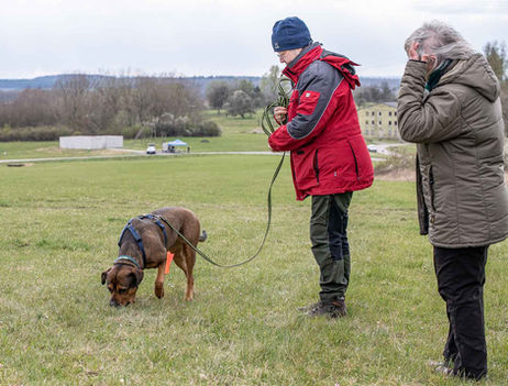 Personenanzeige: Am Ende der Fährte befindet sich eine versteckte Person, die der Hund sicher anzeigen muss.